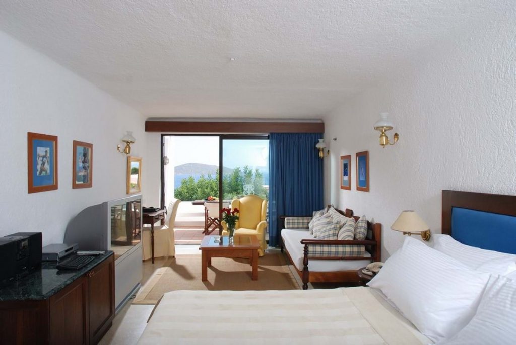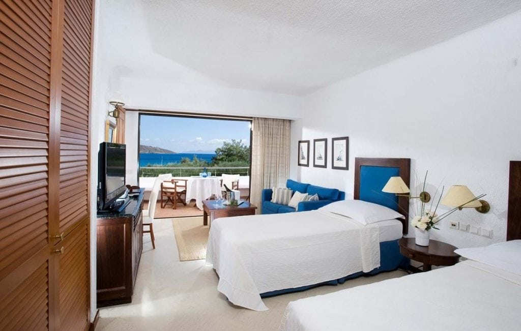 Из этих стильно обставленных и красиво оформленных номеров открывается очаровательный боковой вид на критские воды. Они состоят из спальни с двумя односпальными кроватями или кроватью-платформой Queen size, отделанной мрамором ванной комнаты и отдельного балкона. По запросу, семьям предоставляется смежное размещение в номерах Side Sea View.