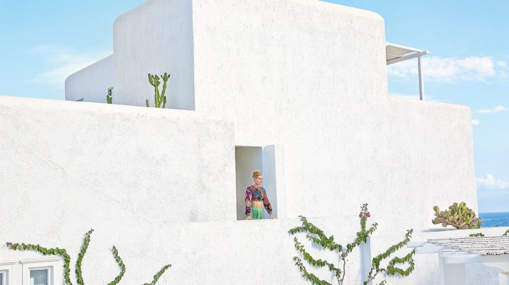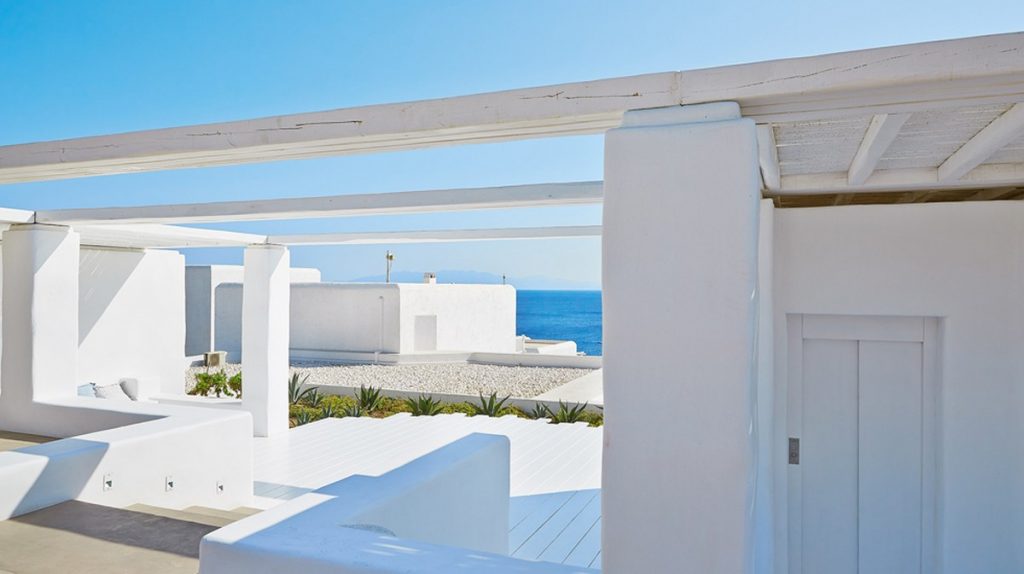 Просторные номера в бело-голубых тонах, отражающие кикладский стиль. Потолок, создающий эффект голубого неба, кровать королевского размера под белоснежной вуалью, множество мягких подушек на софе вырезанной из камня, оригинальные светильники и кофейный столик - это лишь некоторые элементы декора, использованные в оформлении спальни и салона открытого плана. Большая ванная комната оборудована двумя раковинами, ванной и отдельной, душевой из отполированного камня с эффектом светотерапии. Просторная терраса с летней мебелью и индивидуальный бассейн завершают живописную картину.