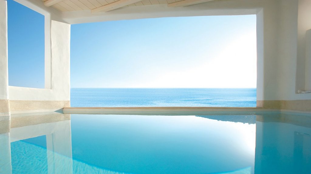 Waterfront bungalow расположены в самом престижномместе отеля, с изумительным видом на бескрайний голубой горизонт, где сливается небо и Эгейское море. В декоре преобладают аквамариновые и игристо- лазурные цвета моря и чисто белый, отличительный цвет кикладской архитектуры. В номере романтическая кровать, декорирована белоснежной вуалью и мягкими подушками. Оригинальные светильники и потолок с эффектом облачного неба подчеркивают изысканность номеров. В ванной комнате душевая в виде грота из отполированного камня с эффектом светотерапии.