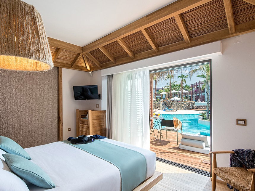 Эти экзотические номера расположены на первом этаже Stella Island Luxury Suites & Spa и имеют прямой выход к кристальной лагуне со своего деревянного патио с шезлонгами. Номера идеально подходят для молодоженов и просто для влюбленных пар, которые могут любоваться величественной красотой бассейна в виде лагуны, не выходя из номера - с собственного деревянного патио. Просторная спальня обставлена стильной мебелю, кроватью королевского размера, заполненым баром и телевизором с плоским экраном. В изысканной ванной находится душевая кабина и туалетные столики с раковинами для него и для нее. Гостям предлагается внимательный сервис и индивидуальное обслуживание номеров.