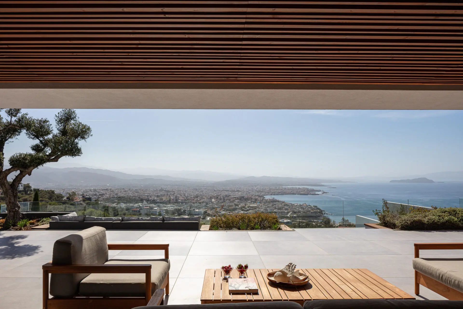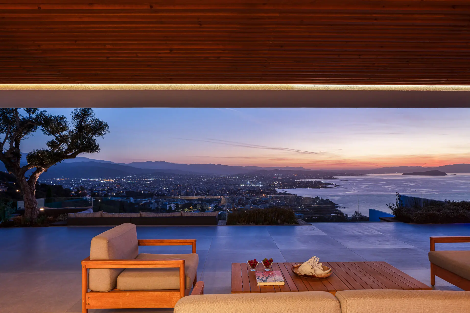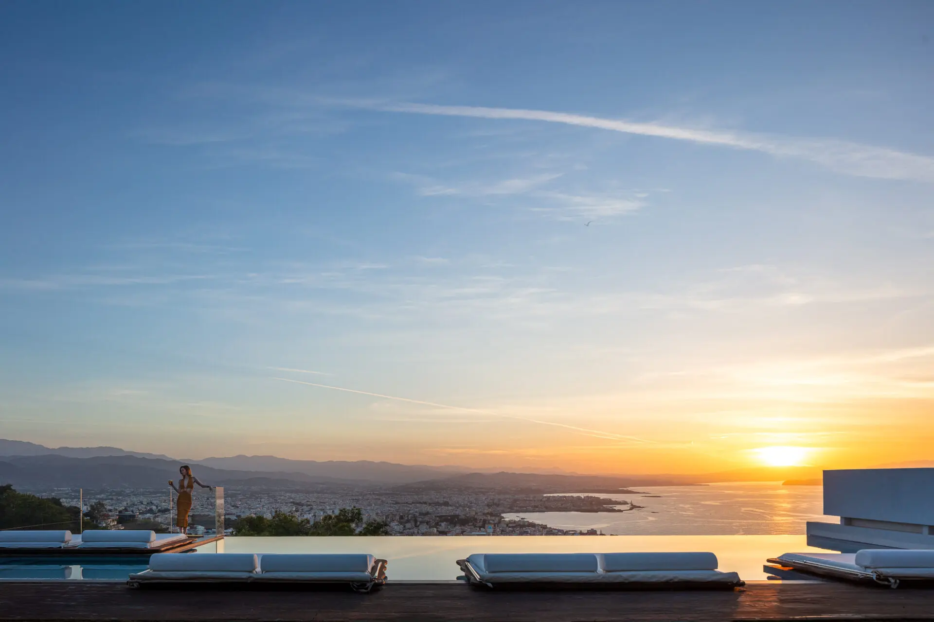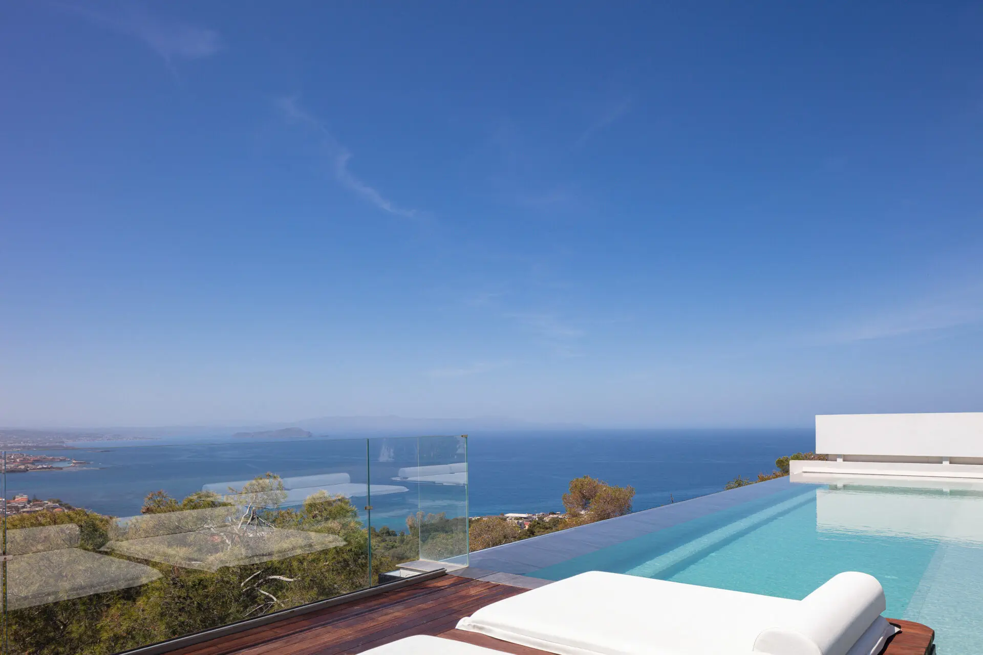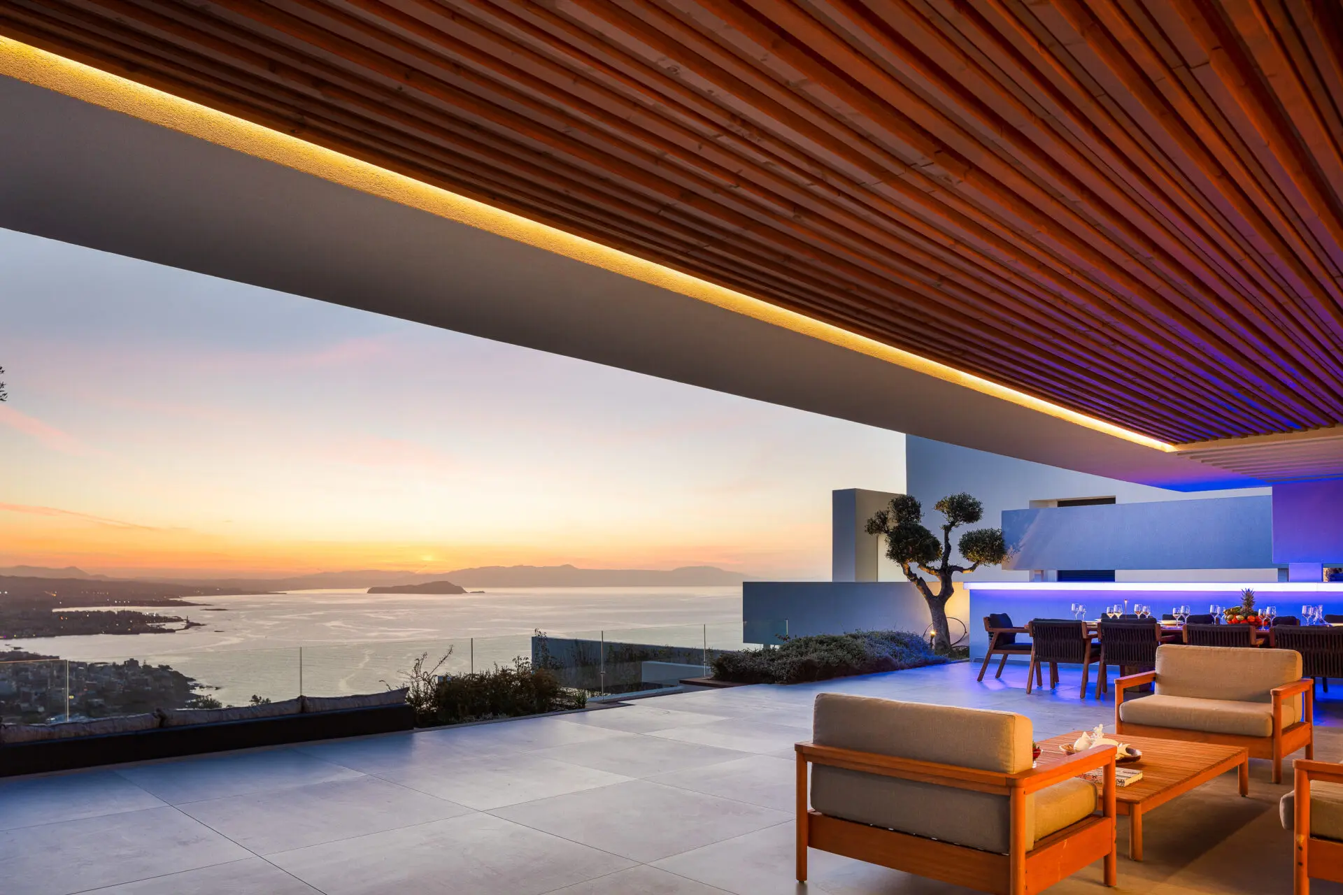 Cavo Dago Villa crowns the hill of Profitis Ilias in Chania—a sanctuary where architecture, light and landscape merge. Every glass line frames the Aegean horizon; every material—stone, teak, concrete and steel—reflects the villa’s design ethos: clarity, balance, emotion.