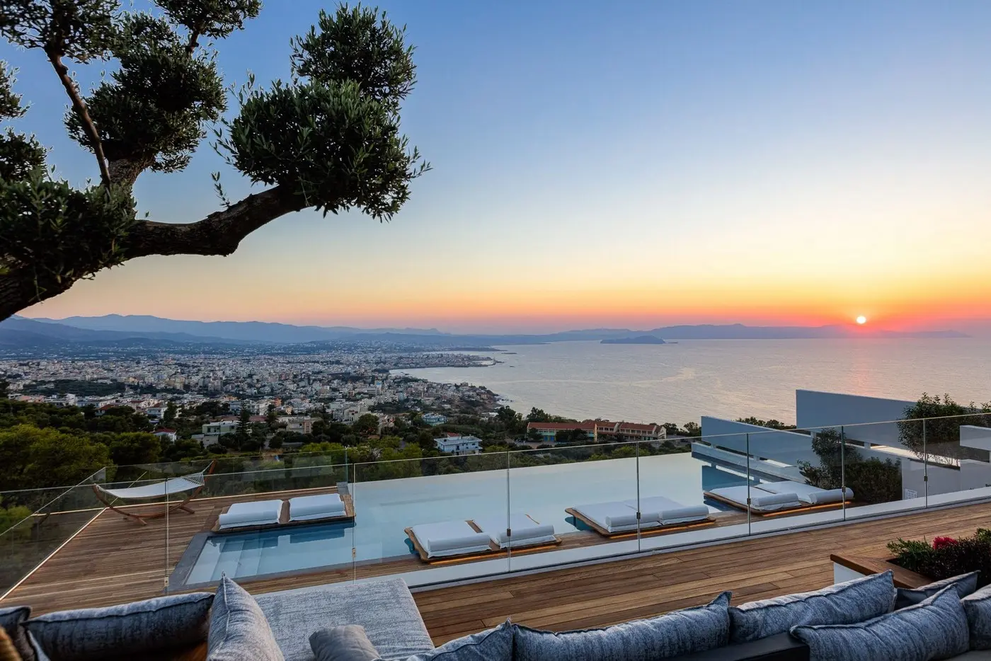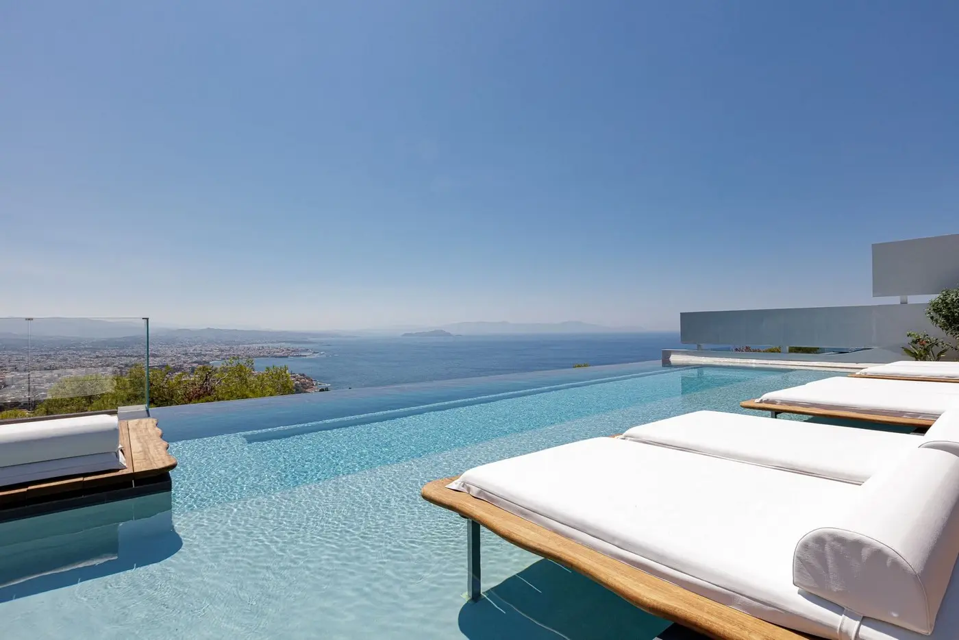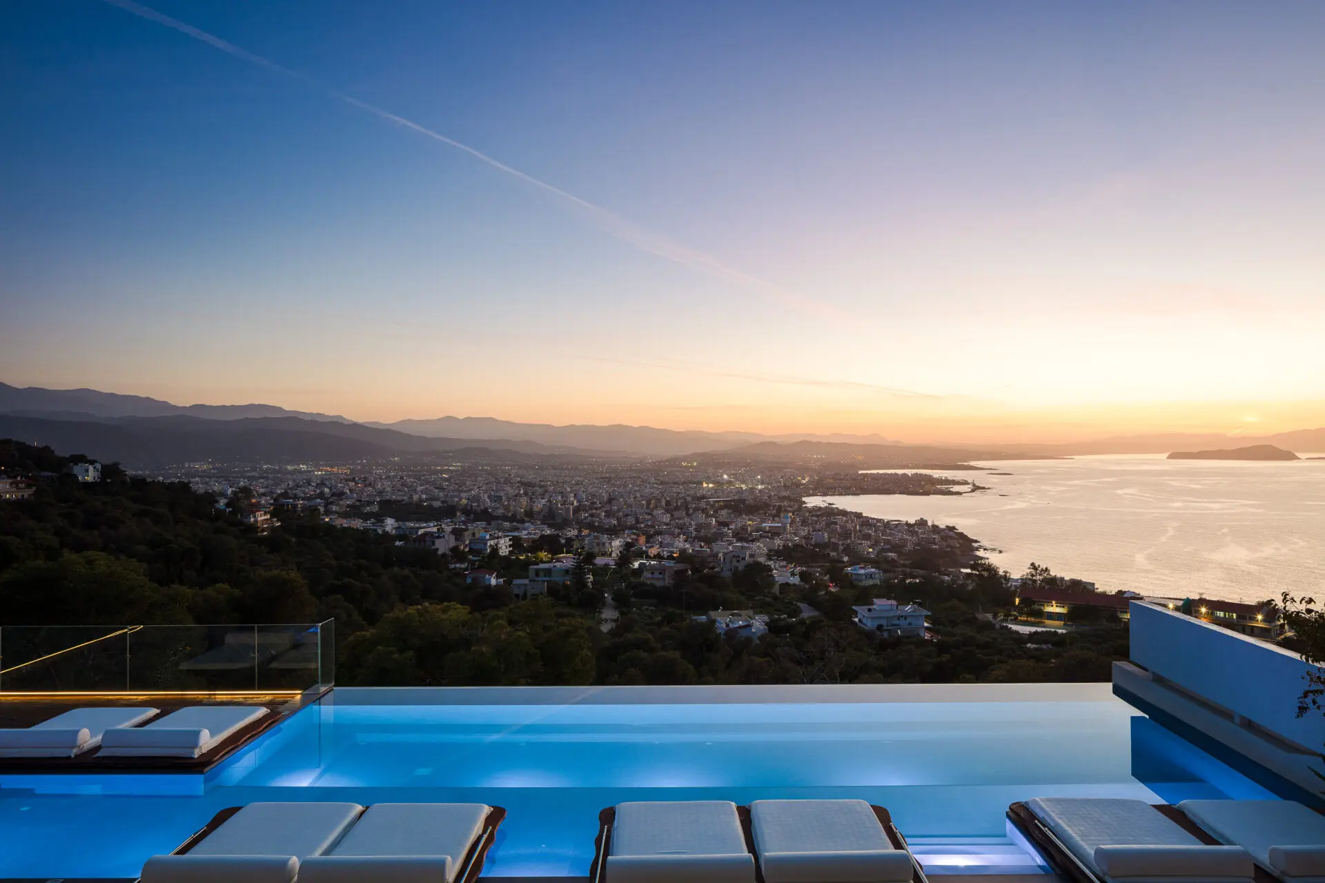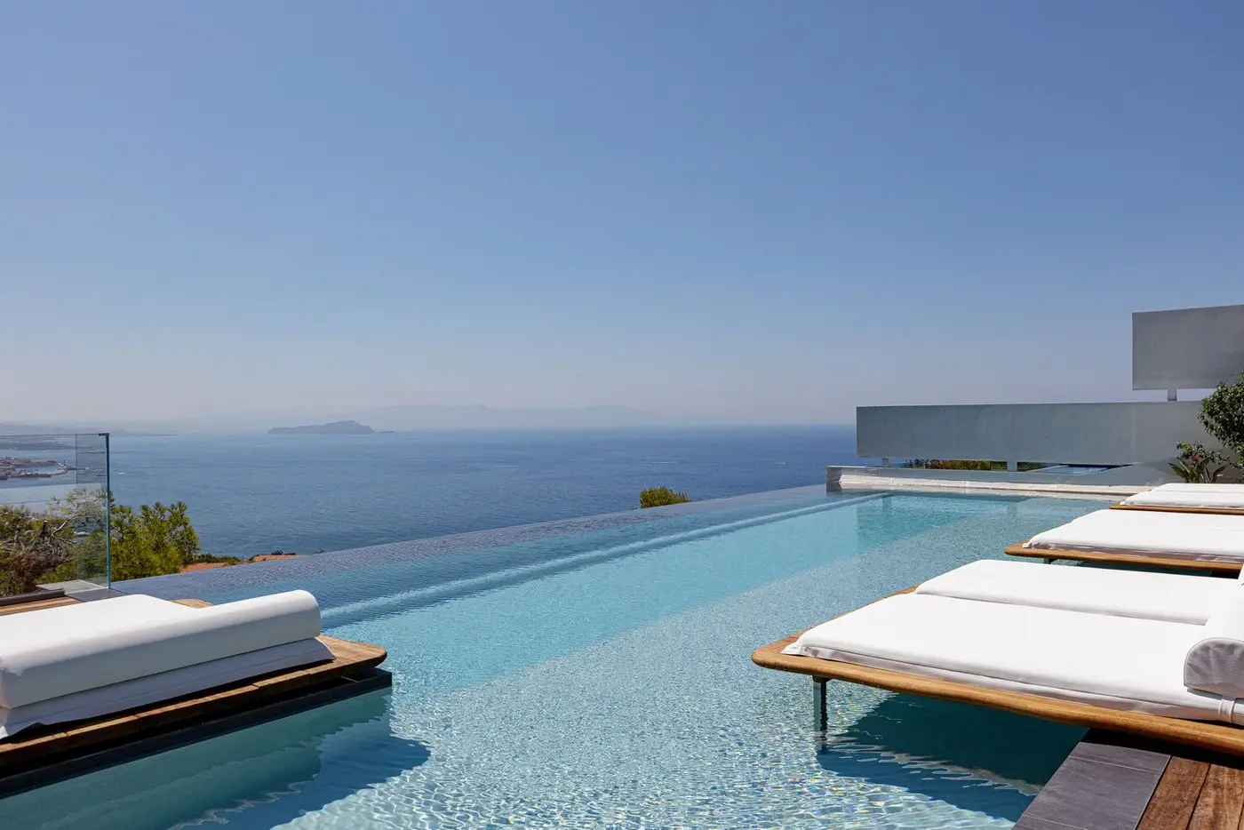 Cavo Dago Villa crowns the hill of Profitis Ilias in Chania—a sanctuary where architecture, light and landscape merge. Every glass line frames the Aegean horizon; every material—stone, teak, concrete and steel—reflects the villa’s design ethos: clarity, balance, emotion.
