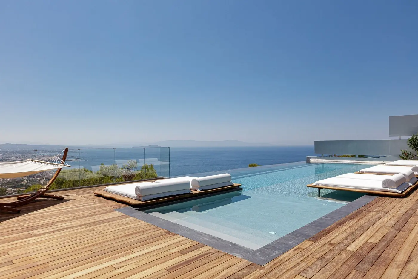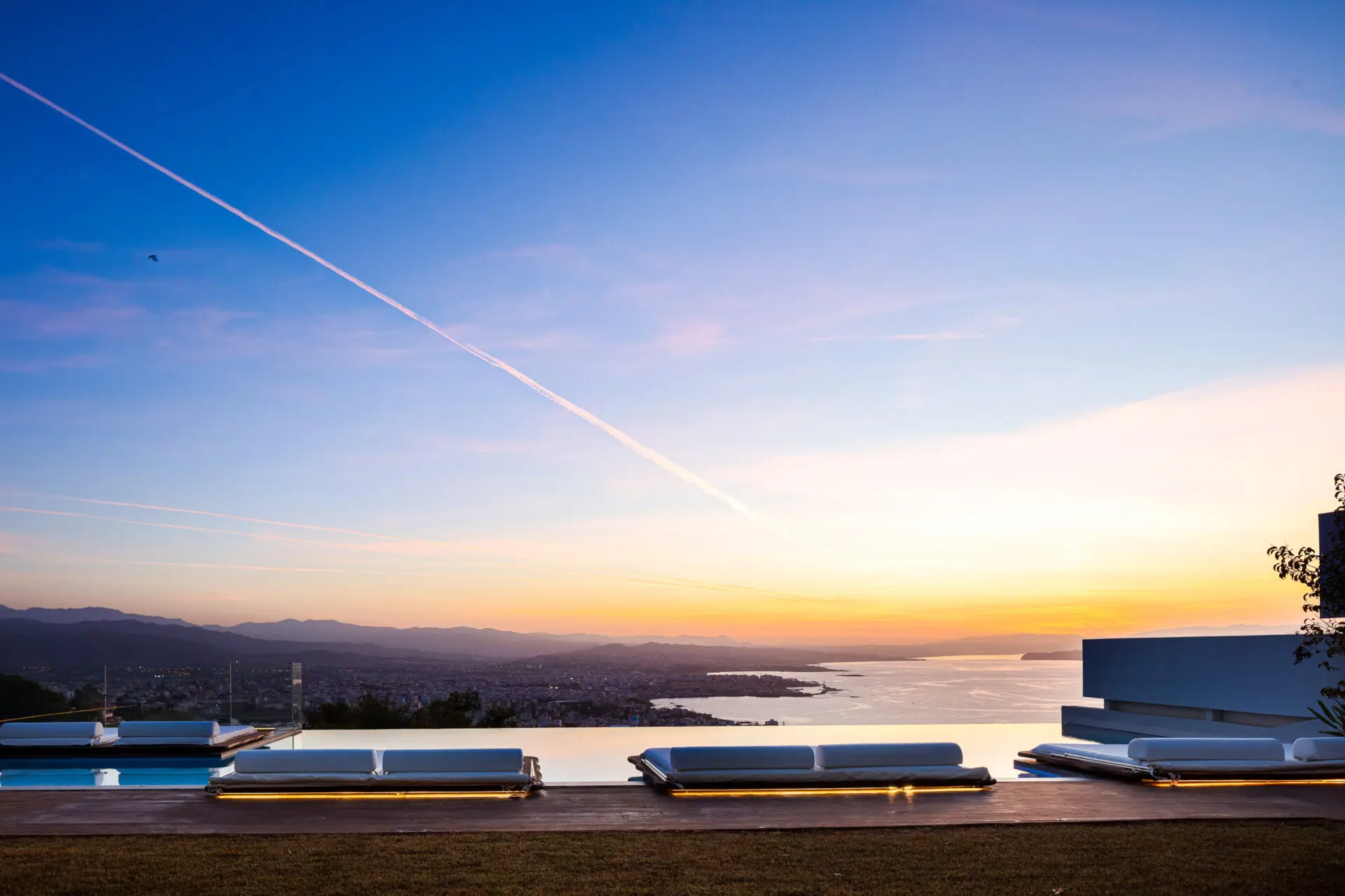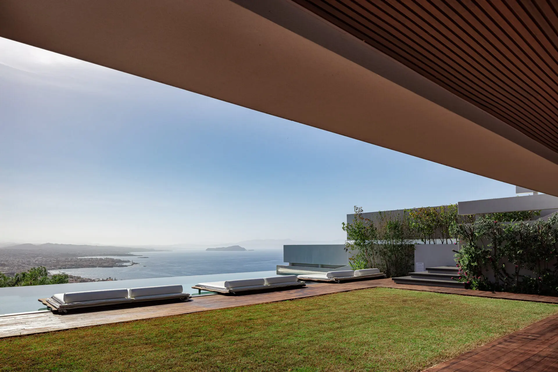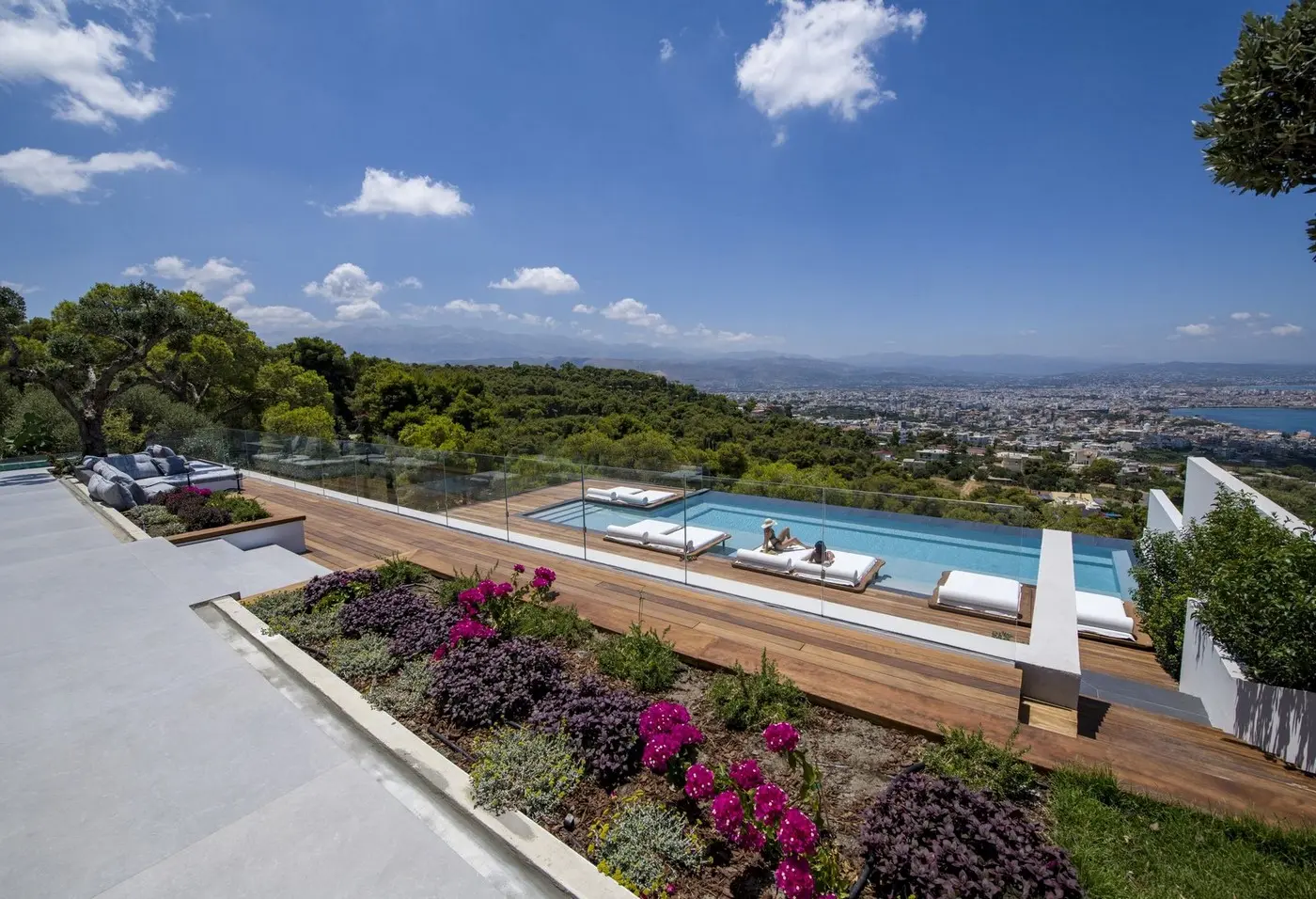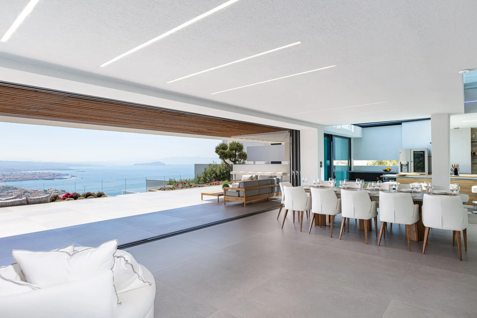 Cavo Dago Villa crowns the hill of Profitis Ilias in Chania—a sanctuary where architecture, light and landscape merge. Every glass line frames the Aegean horizon; every material—stone, teak, concrete and steel—reflects the villa’s design ethos: clarity, balance, emotion.