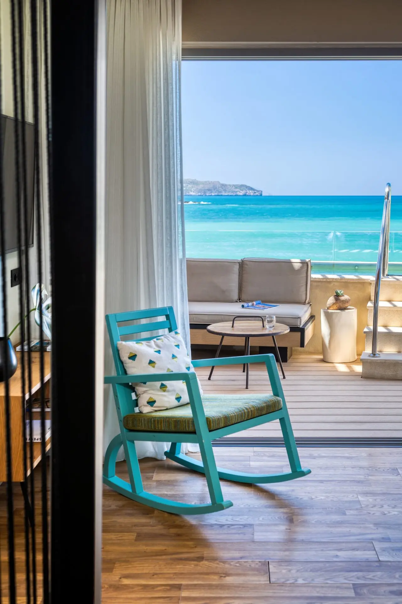 Mornings unfold with soft music and sea light; by midday, conversation hums beside the water. Then sunset arrives — and the world exhales. Sandstone domes, inspired by Chania’s Venetian Arsenals, create a rhythm of light and shade. Inside, surfaces breathe: timber, linen, rattan, air — the natural textures of a five-star design resort in Crete where every detail feels alive.