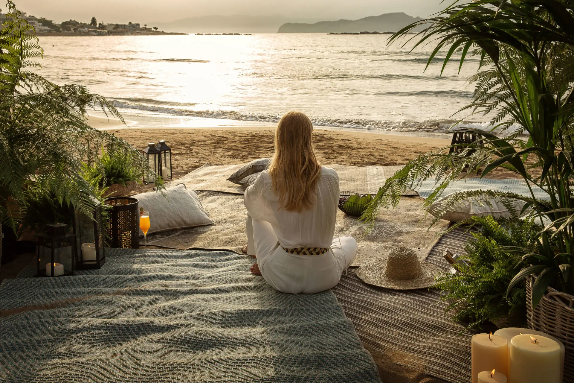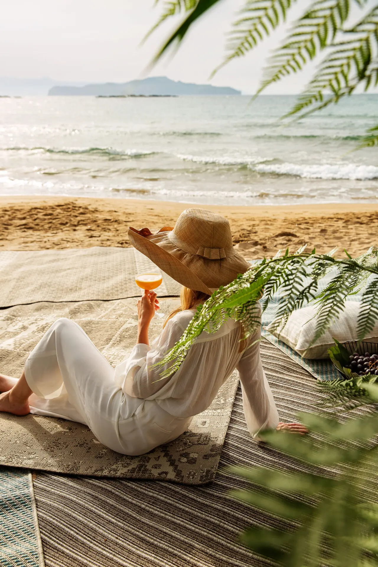 Set along the curve of Agioi Apostoloi Beach, just ten minutes from the Venetian Harbor, Domes Noruz Chania lives in two worlds at once – steps from the city’s life, yet quietly apart. From here, days unfold effortlessly: strolls into Chania’s Old Town for galleries, wine bars, and hidden courtyards; unhurried afternoons on nearby beaches where locals swim until dusk. The drive from the airport traces the island’s soft edge – olive groves, wild thyme, sea light – until you arrive at a place that feels both designed and discovered. This is not just a location; it’s a transition between presence and pause.