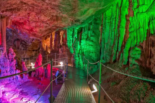 The road narrows as you climb to the entrance of Diktaion Andron — the Cave of Zeus. The air cools; conversation softens. Your footsteps echo against the stone as your guide’s voice fades into silence, replaced by the ancient sound of dripping water. Inside, stalactites shimmer like frozen prayers. For a moment, you understand why myth was born here — in this union of earth and divinity, where even breath feels sacred.